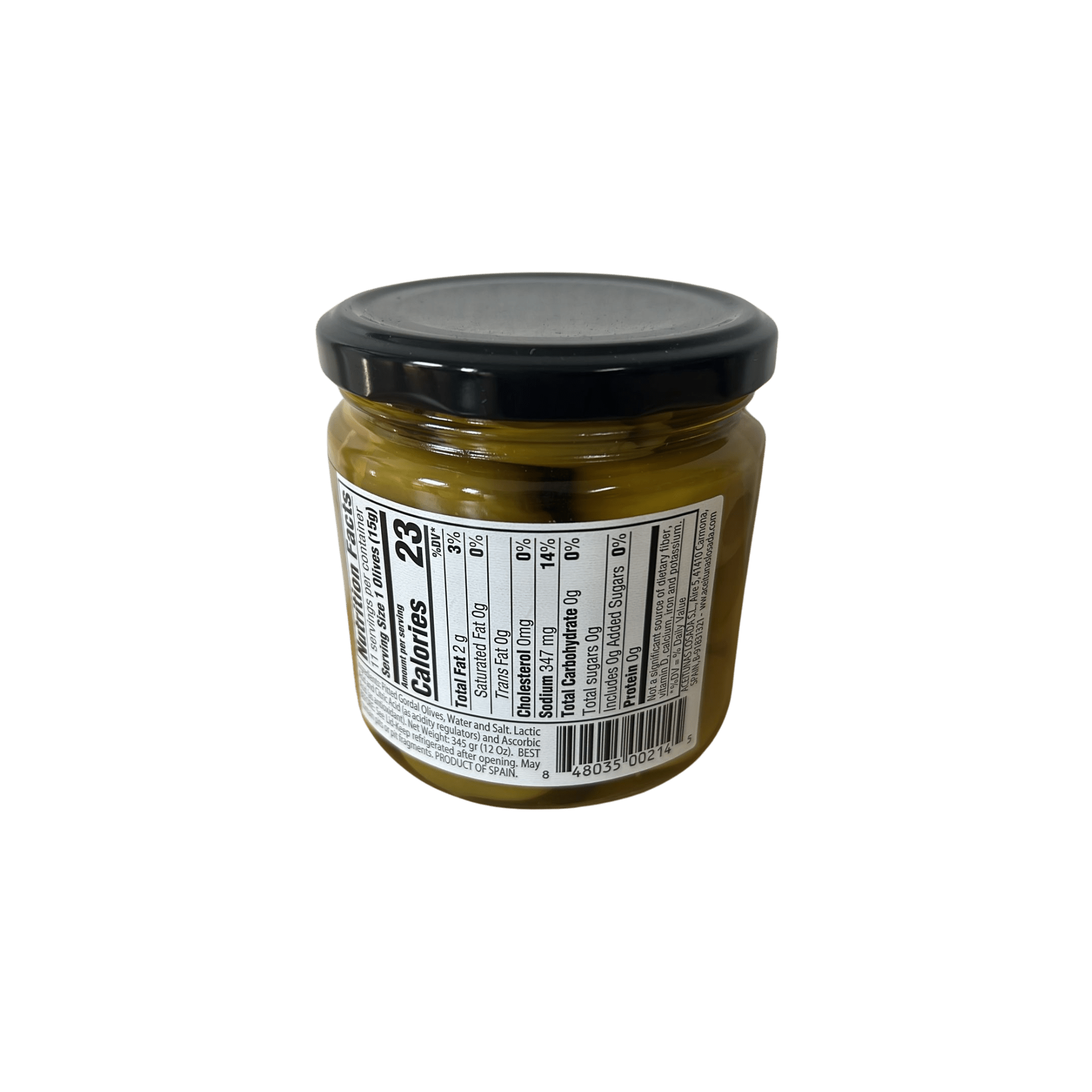 Pitted Gordal olives, water and salt. Monosodium glutamate, lactic acid, citric acid and ascorbic acid.