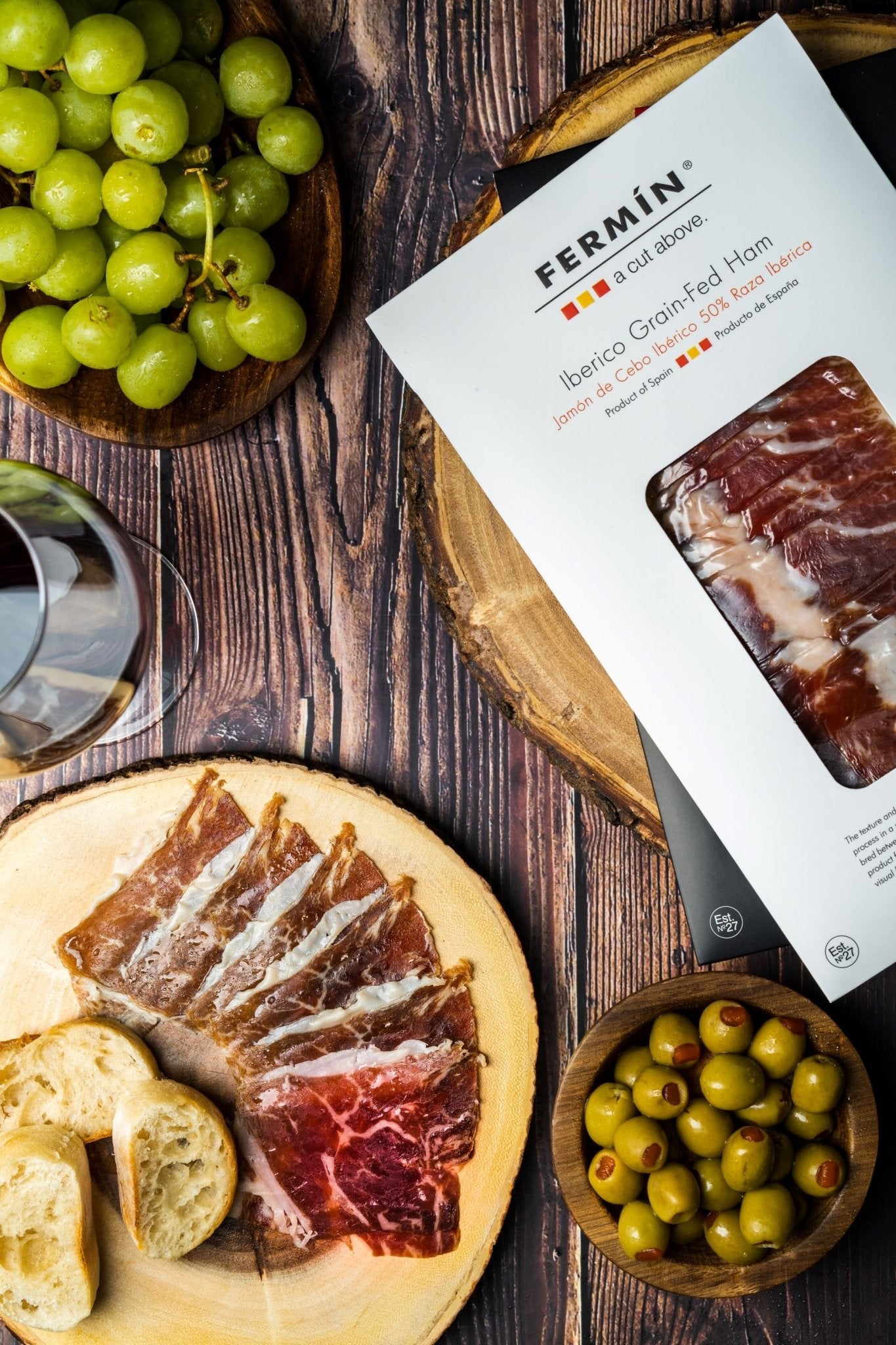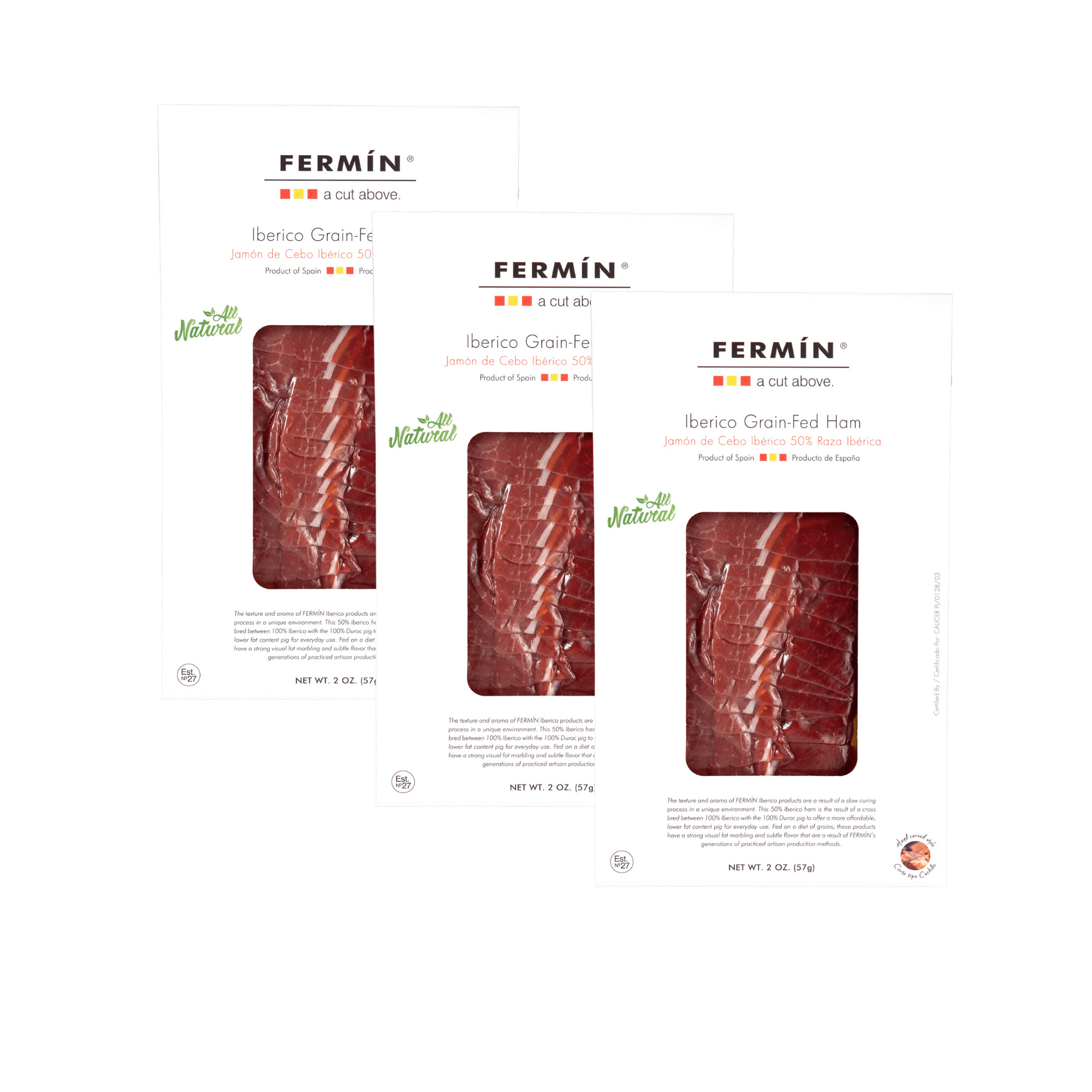 The texture and aroma of Fermin Iberico products are a result of a slow curing process in a unique environment. This 50% Iberico ham is the result of a cross bred between 100% Iberico with the 100% Duroc pig to offer a more affordable product for everyday use. Fed on a diet of grains, these products have a strong visual fat marbling and subtle flavor that are a result of Fermin's generations of practiced artisan production methods.