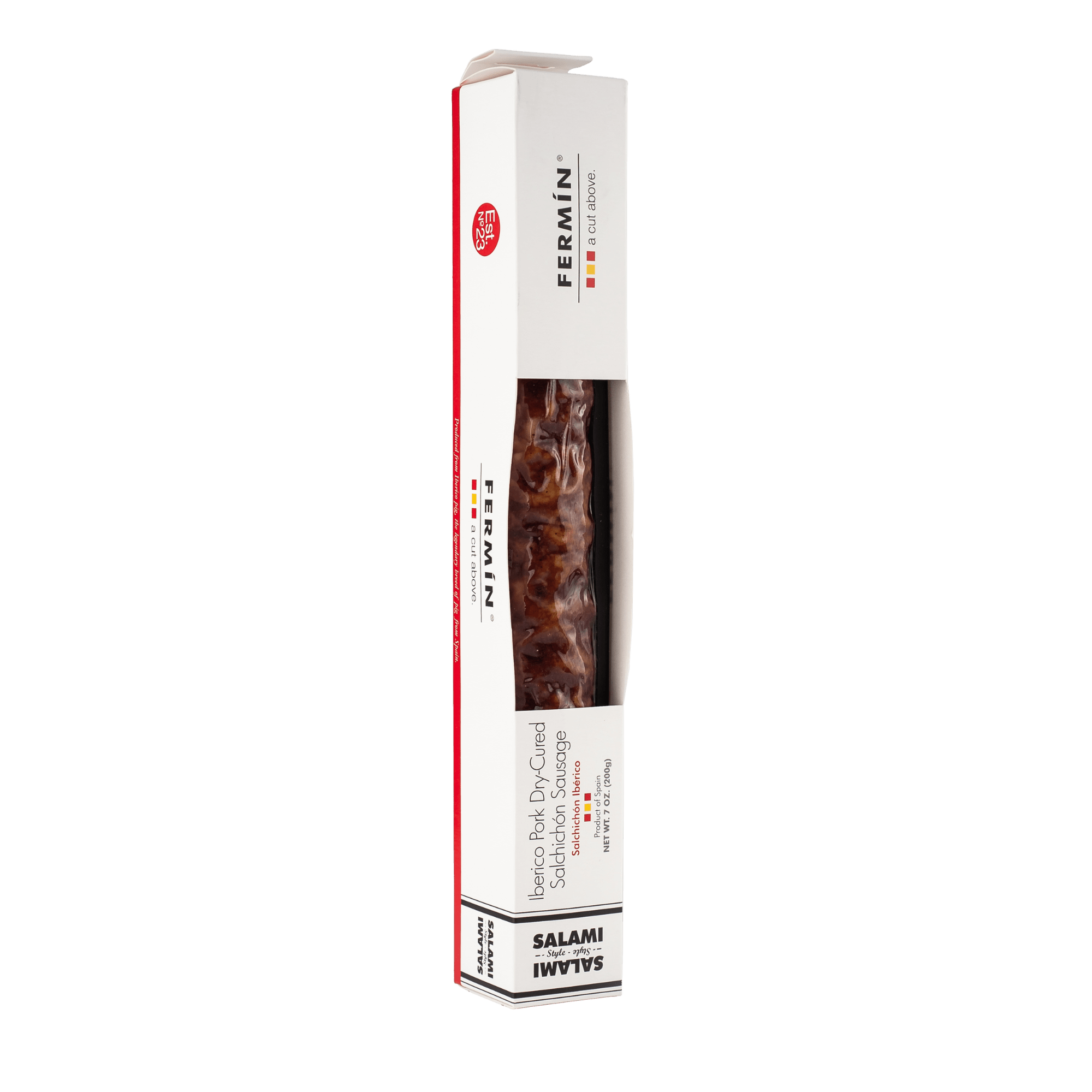 A unique product of singular juiciness and delicate flavor, seasoned with nutmeg, black and white pepper. Similar to chorizo, but here without use pimentón. This salchichon has been made from the best cuts of the Ibérico pig, an original breed from Spain.