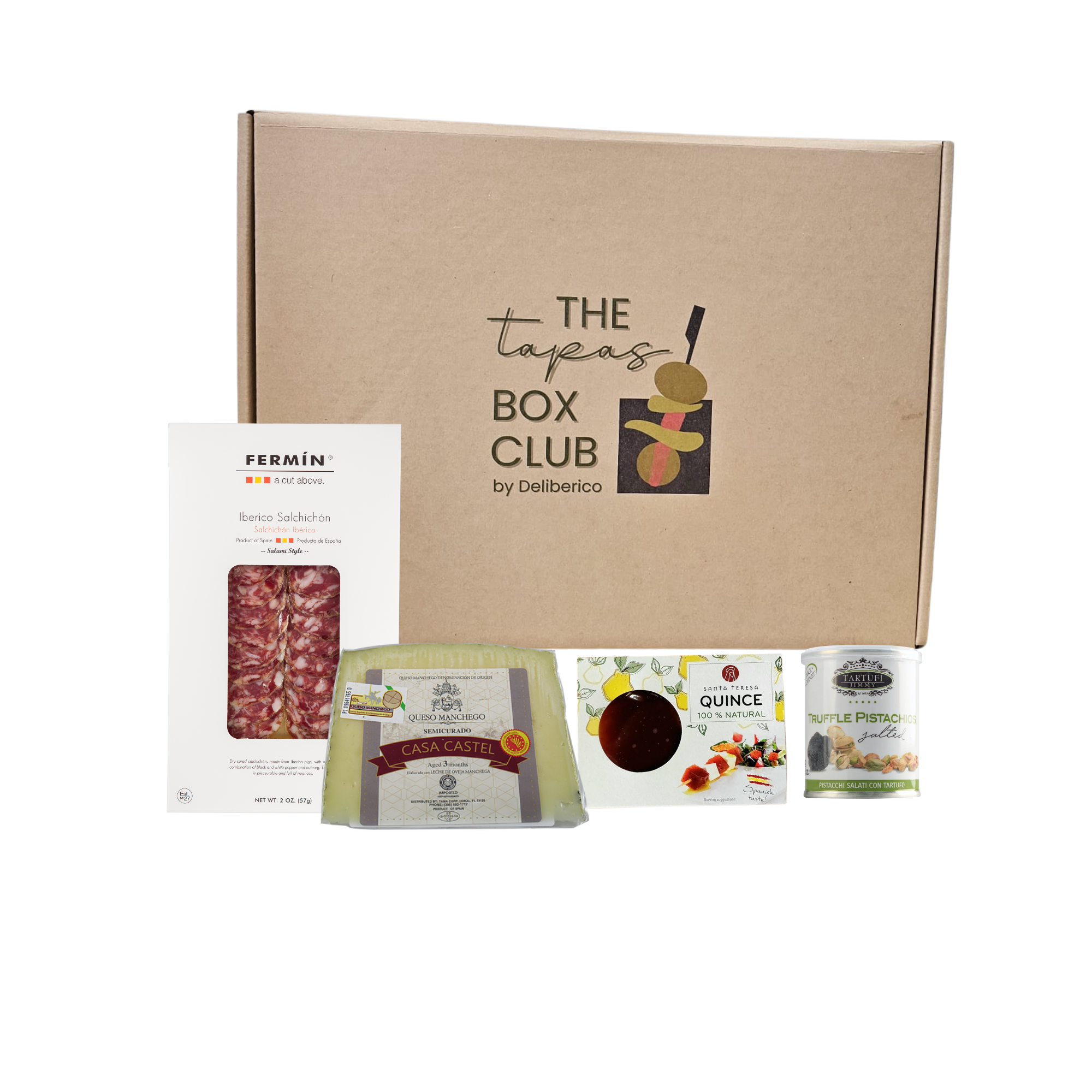 En esta caja de tapas destaca el perfil de sabor del salchichon ibérico , aromáticos pistachos a la trufa y un intenso y cremoso queso manchego español , que maridan a la perfección con la delicada dulzura del membrillo , un clásico español atemporal. Descubra una sinfonía de sabores que celebra lo mejor de la gastronomía española en una irresistible experiencia de tapas.