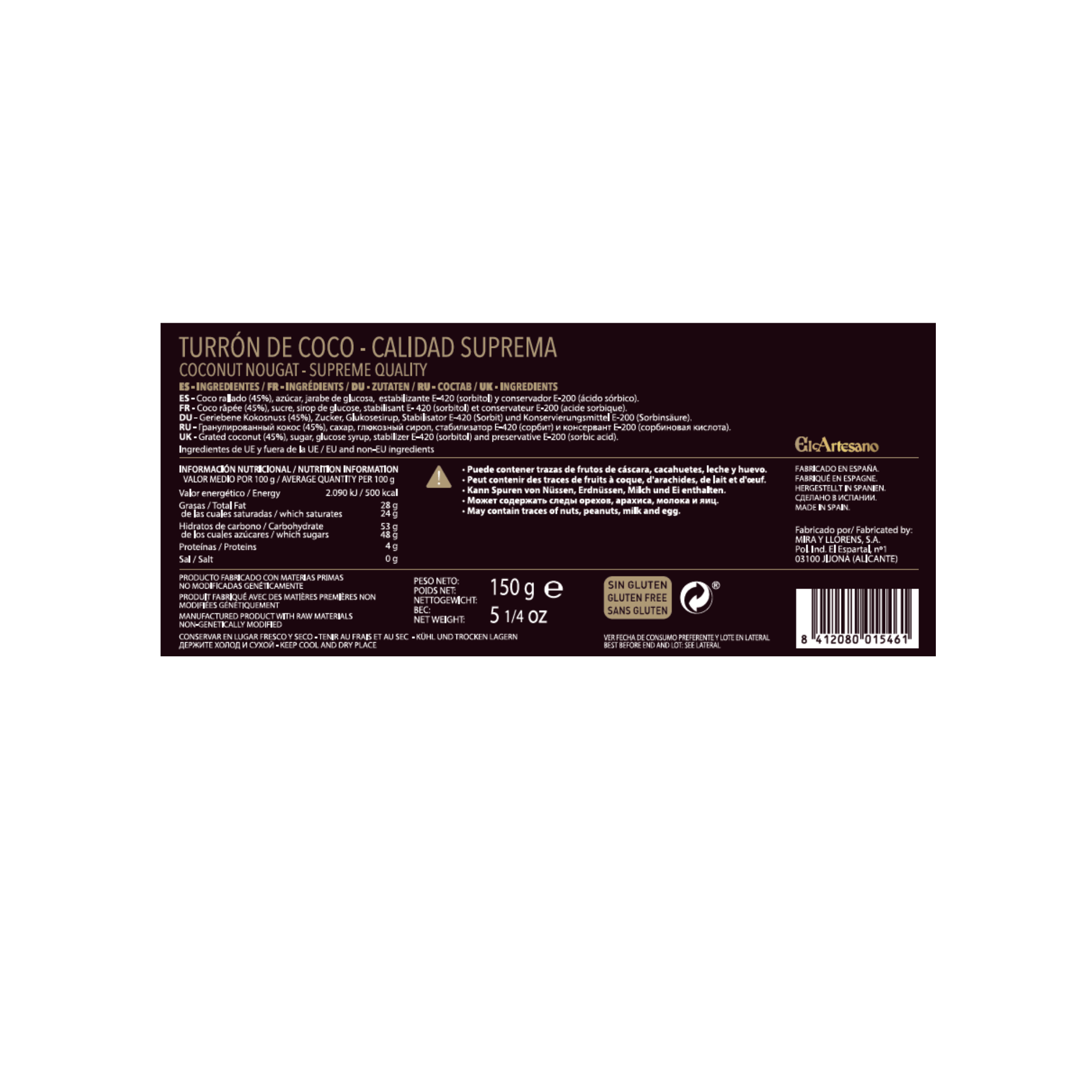 Coco rallado (45%), azúcar, jarabe de glucosa, estabilizante E-420 (sorbitol), conservante E-200 (ácido sórbico).
