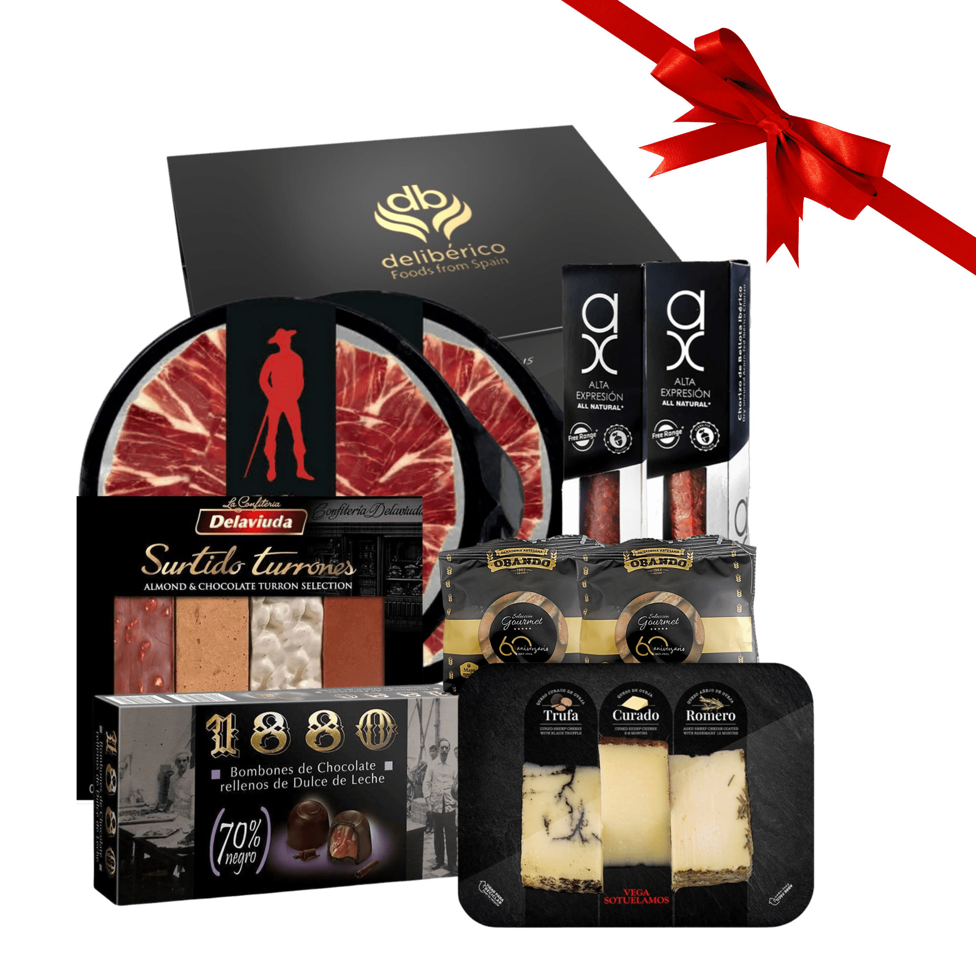 Esta elegante colección reúne lo mejor de la tradición ibérica y los quesos artesanos más finos, acompañados de las crujientes Picos de Pan, irresistibles bombones de chocolate negro rellenos caramelo y una festiva selección de turrones tradicionales españoles.