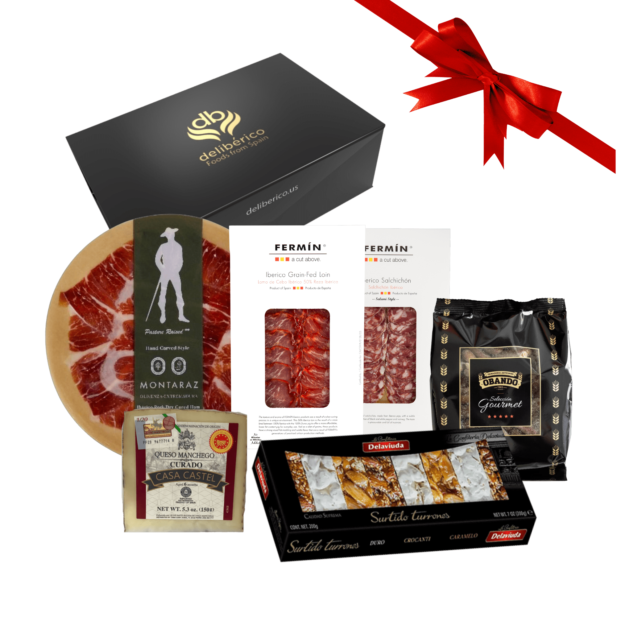 Incluye una exquisita selección de charcutería artesanal, quesos de primera calidad y dulces tradicionales españoles, todo cuidadosamente presentado en nuestras elegantes cajas negras y doradas.