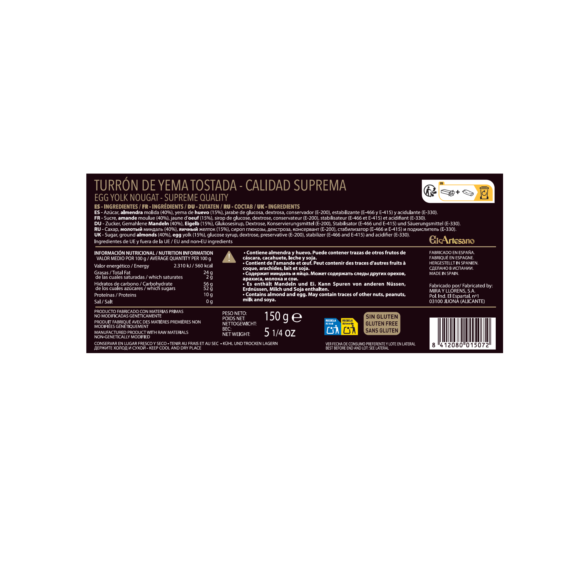 Elaborado con almendras de primera calidad, yema de huevo fresca y una dedicación absoluta a las técnicas artesanales, este turrón es el favorito de la pastelería y un clásico imprescindible en las mesas navideñas. Ideal para bandejas de postres, cestas gourmet o simplemente para disfrutar un capricho auténticamente español.