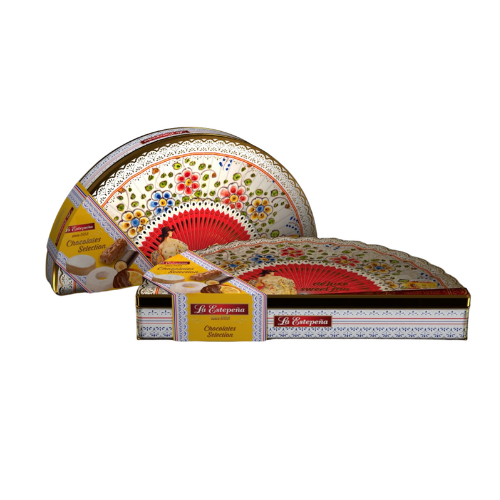 It includes Almond Polvorones, Roscos de Vino, Estepeñitas, Fruit chocolateadas, and Bars stuffed with chocolate. These are traditional Spanish Christmas biscuits and pastries. Moreover, the perfect gift comes in a stunning box shaped like a Flamenco fan!