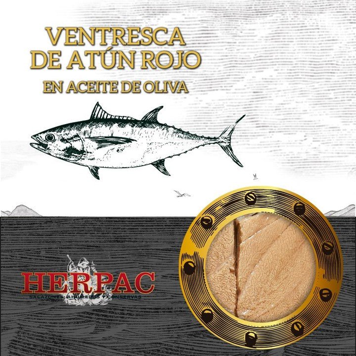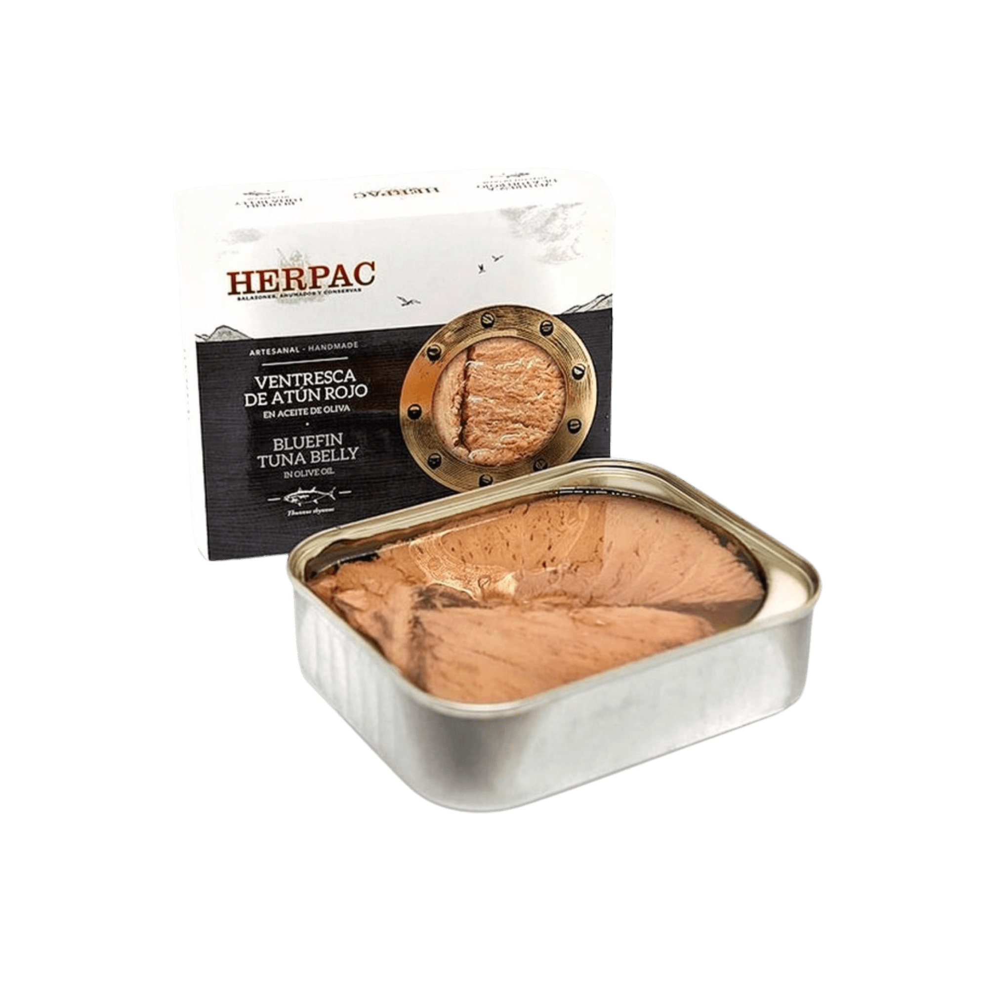 Enjoy the richest, most tender cut of bluefin tuna: the belly, also known as "ventresca." Hand-packed by Herpac, this melt-in-your-mouth fillet boasts exquisite texture and a deep, savory flavor that sets it apart from any other canned tuna.