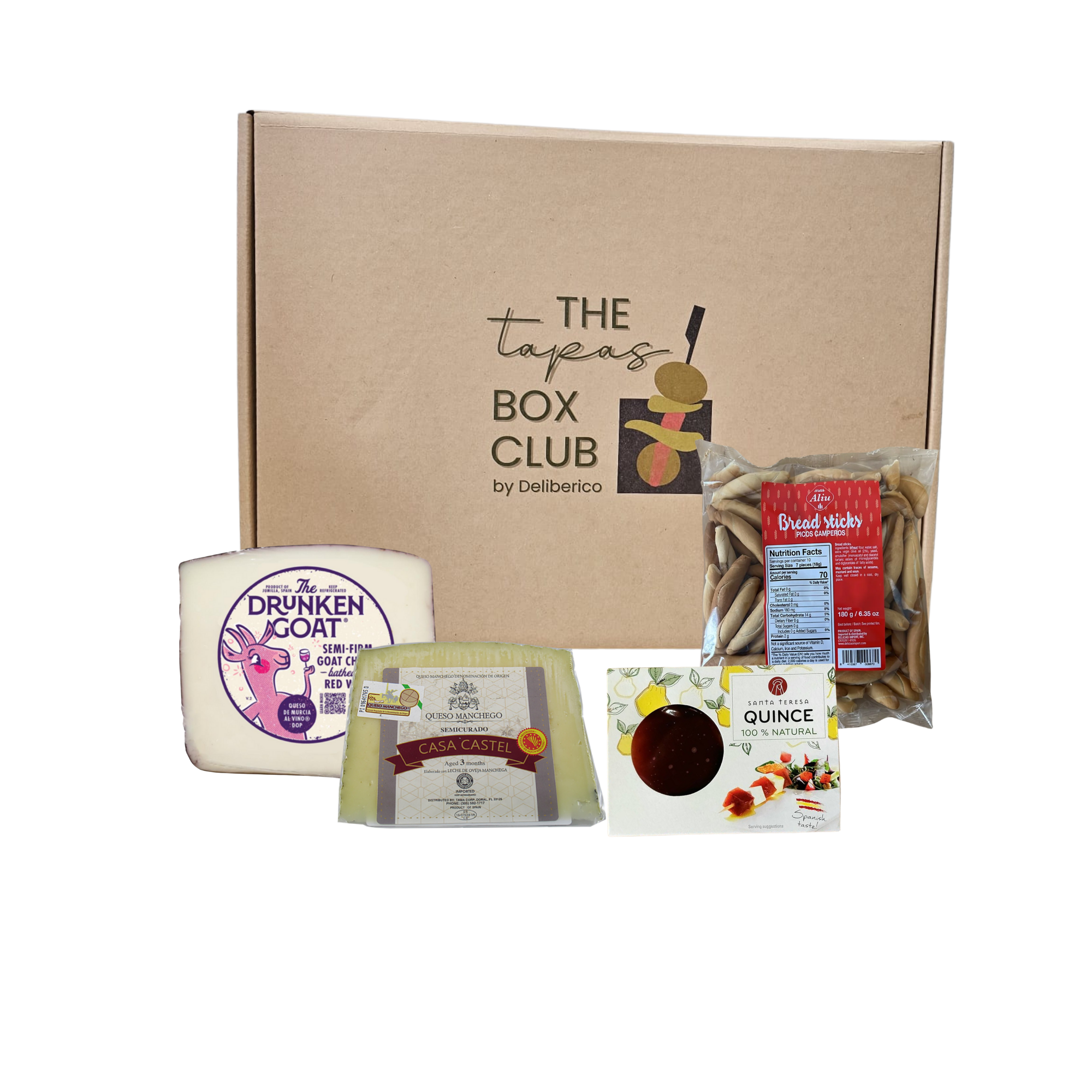 Indulge in an authentic Spanish cheese experience with our Cheese Lover Tapas Box, thoughtfully curated for true cheese enthusiasts. This flavorful collection features a rich Manchego Cheese wedge by Casa Castel and the smooth, wine-soaked Drunken Goat Cheese (DOP) from Murcia. To complement these savory selections, enjoy crunchy Camperos Breadsticks by Mas Aliu and a sweet, tangy quince paste—a classic pairing that balances and enhances each bite.