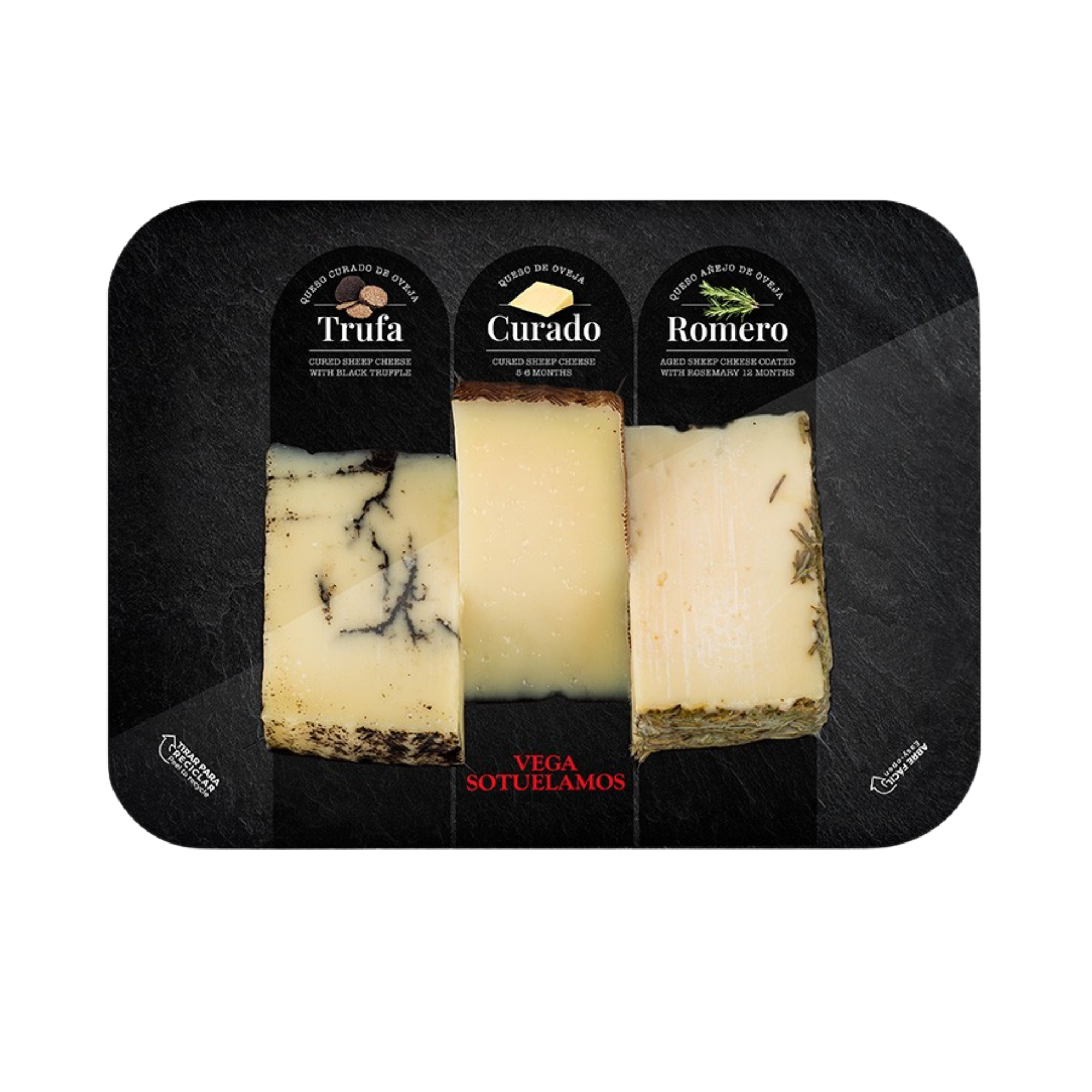 Enjoy an artisanal cheese journey with this award-winning Spanish Cheese Board by Vega Sotuelamos, featuring three distinct varieties of cured sheep’s milk cheese, each offering a unique texture and flavor profile.