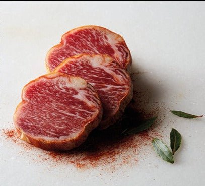 Our exclusive curing process allows us to finely-tune every piece one by one, which guarantees an aroma, a taste and a really exceptional texture. To guarantee the optimum degree of aging of each piece, our Technical Department measures and scores our meats according to over 12 different parameters. Our unique curing process makes it possible to individually refine each piece. Aging for 3 months. Remove packaging 15 min before consumption.