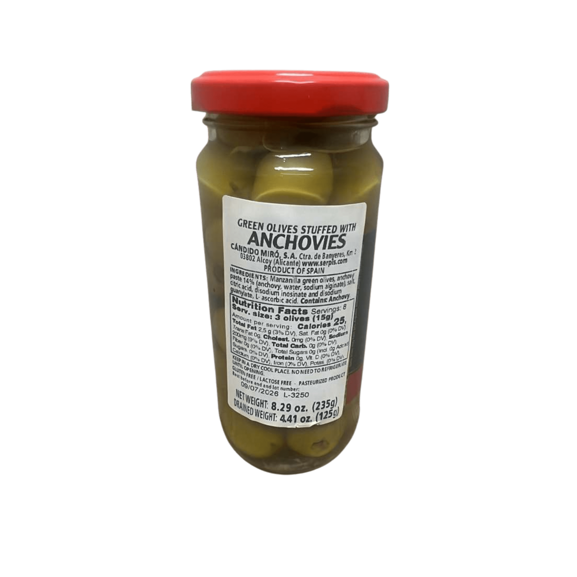 Manzanilla green olives, anchovy paste (14%) (anchovy, water, sodium alginate), salt, citric acid, disodium inosinate and disodium guanylate, L-ascorbic acid. Pasteurized.