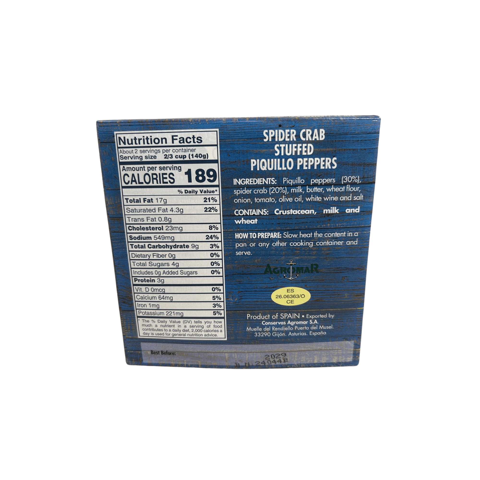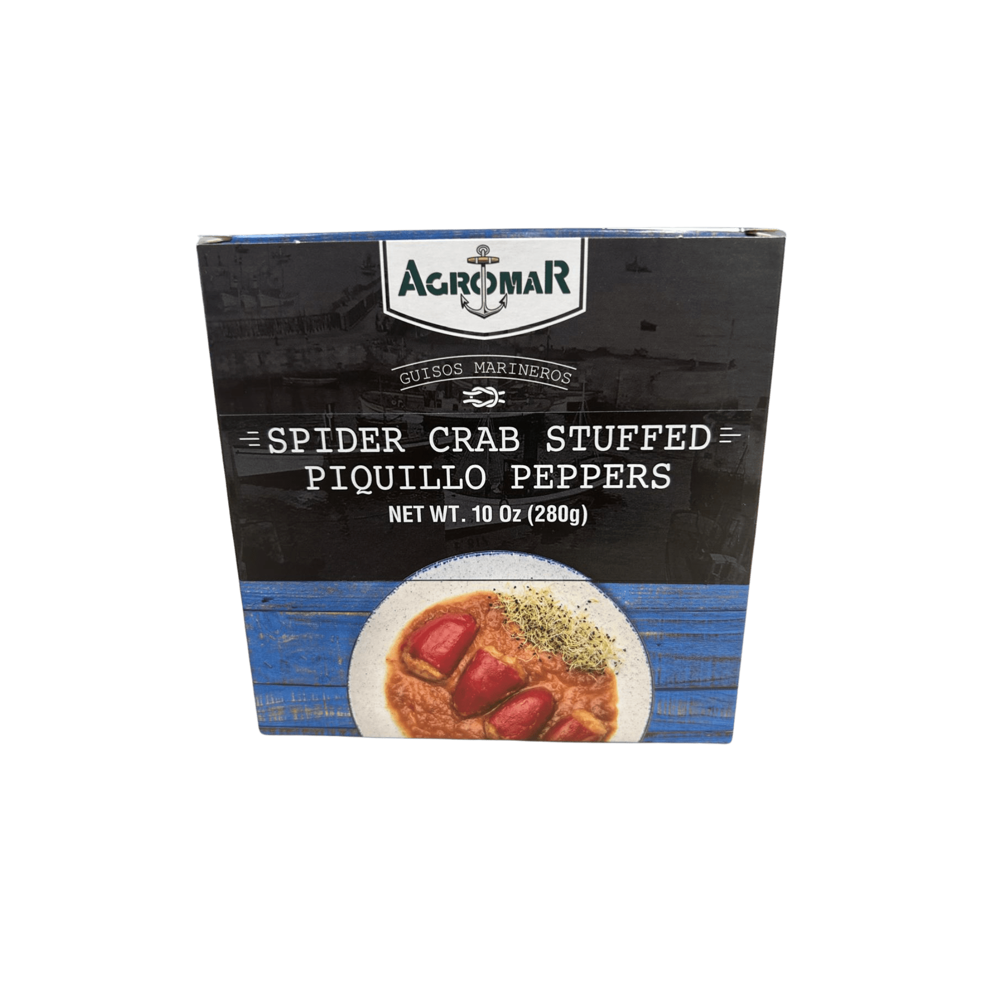 Agromar's Spider Crab Stuffed Piquillo Peppers are a gourmet delicacy, expertly crafted with hand-picked piquillo peppers stuffed with premium spider crab. These flavorful peppers deliver a perfect balance of smoky sweetness from the piquillo and the rich, delicate texture of the crab. Ideal for tapas, appetizers, or a light meal, this artisanal product reflects Agromar's dedication to high-quality, traditional Spanish flavors. Enjoy an authentic taste of Spain with these ready-to-serve stuffed piquillo peppers, perfect for any occasion, especially for a tapas-style meal.